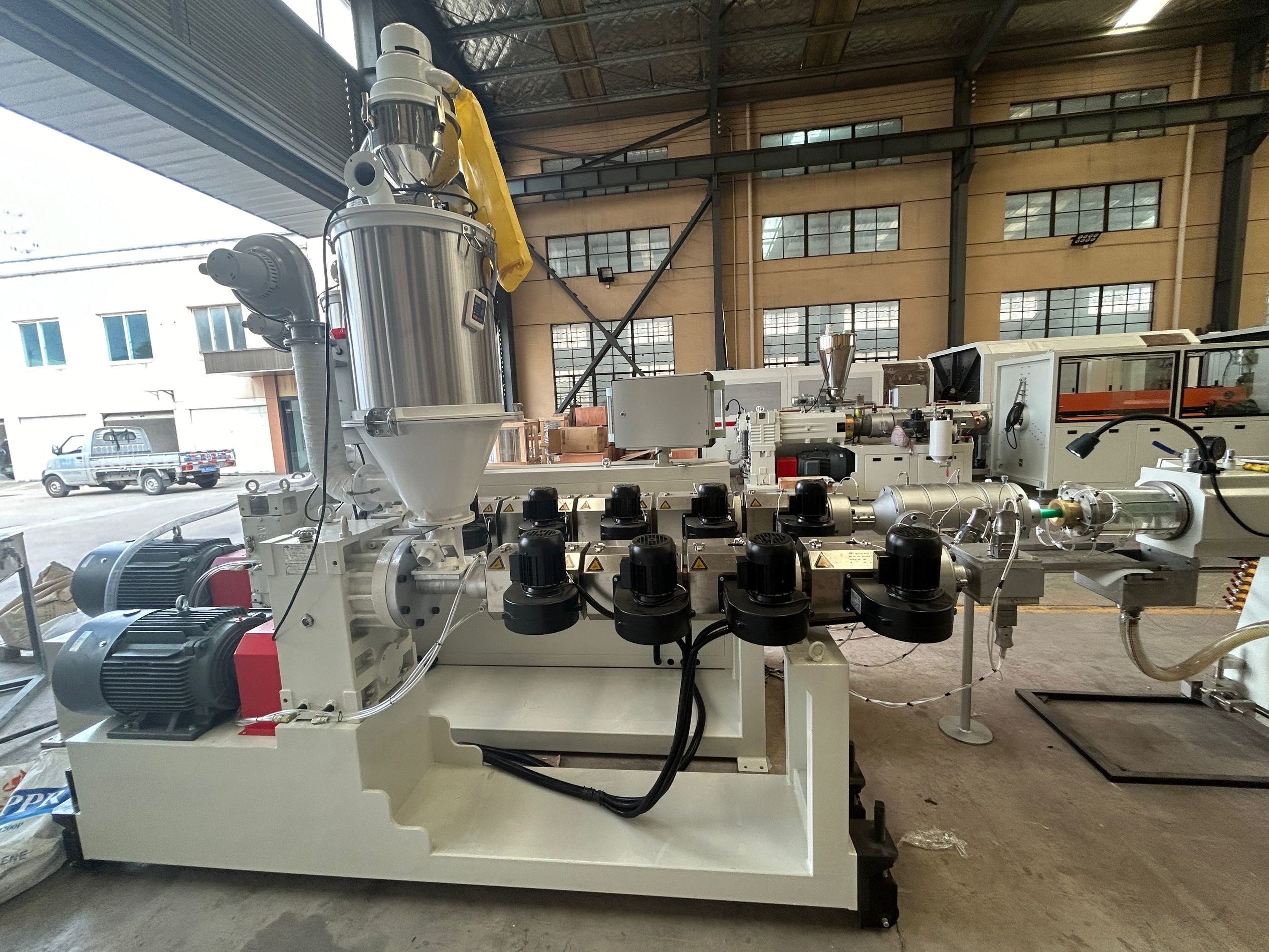 As matérias-primas (granulos de PPR/PVC, aditivos) são automaticamente introduzidas na tolha e misturadas uniformemente.