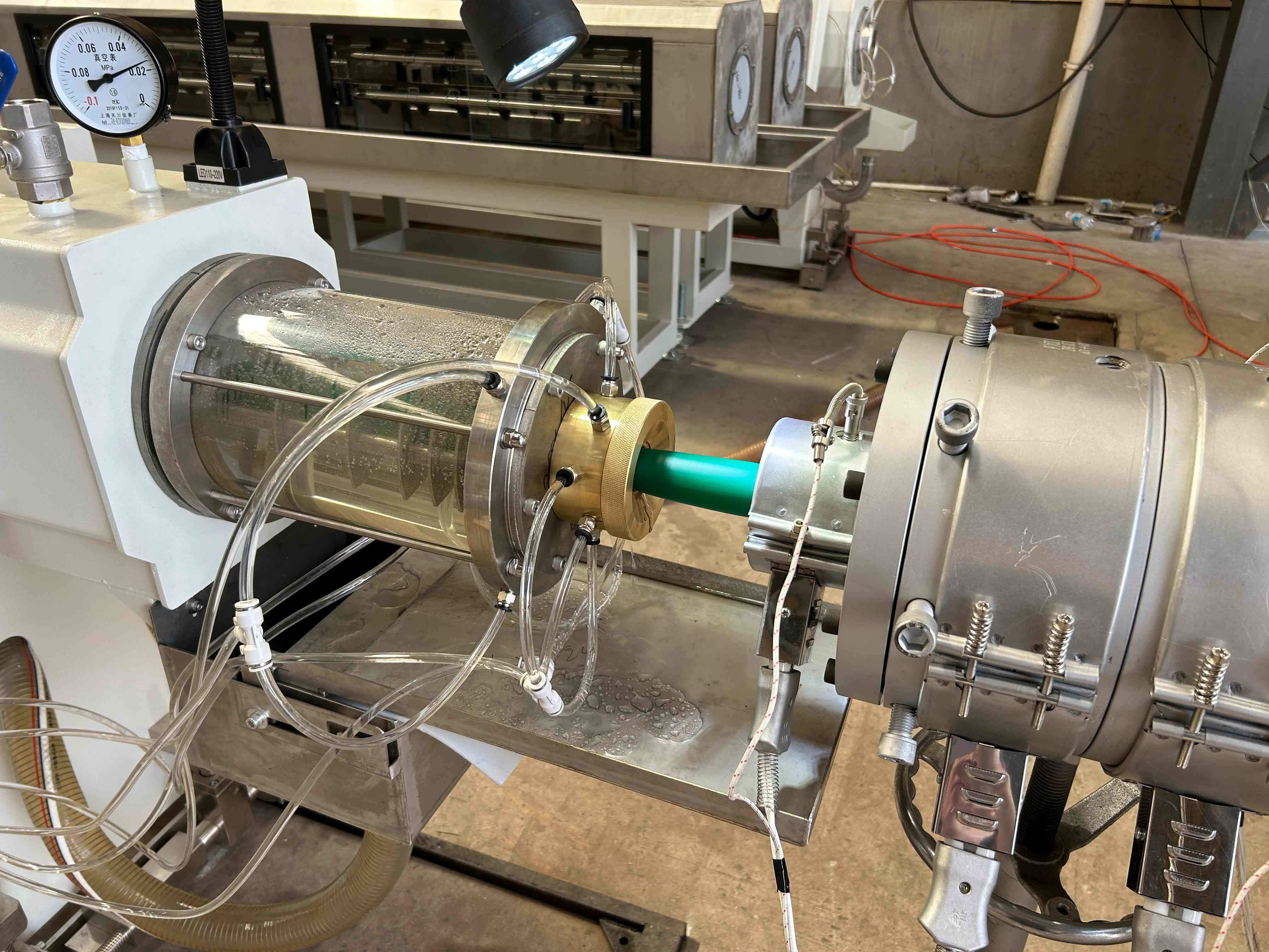 O tubo entra em um tanque de calibração a vácuo para estabilizar o diâmetro e a espessura da parede.