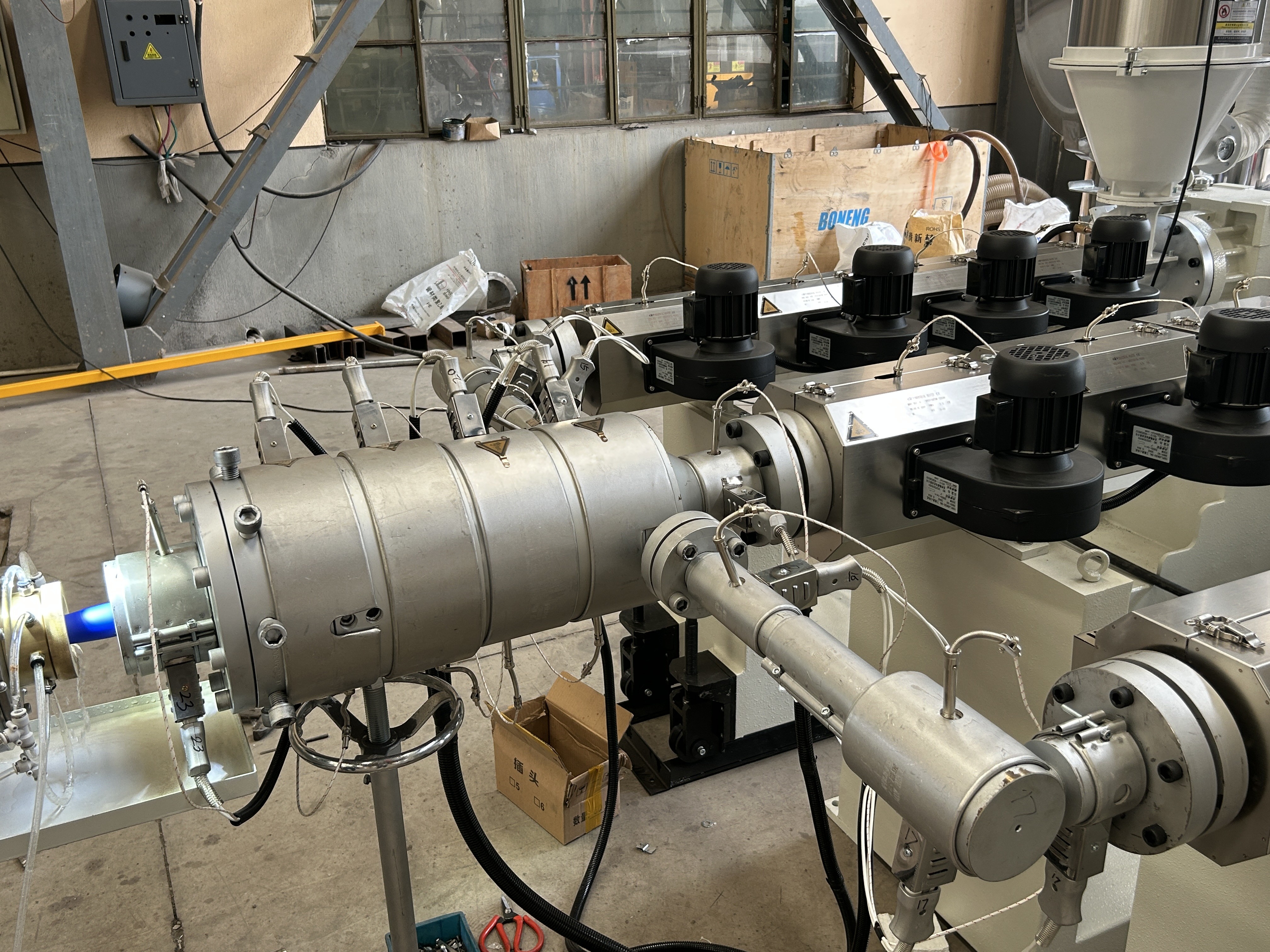 O plástico fundido passa por uma cabeça de matriz para formar tubos/perfis, depois entra em um tanque de calibração a vácuo para dimensionamento e resfriamento precisos.