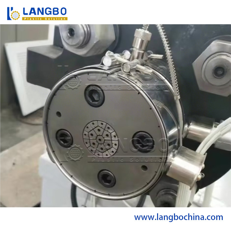 O fluxo do processo desta linha é: pó de PVC + aditivo - mistura - alimentador de material - extrusora de rosca dupla - molde e calibrador - mesa de formação a vácuo - máquina de tração - máquina de corte - suporte de descarga.