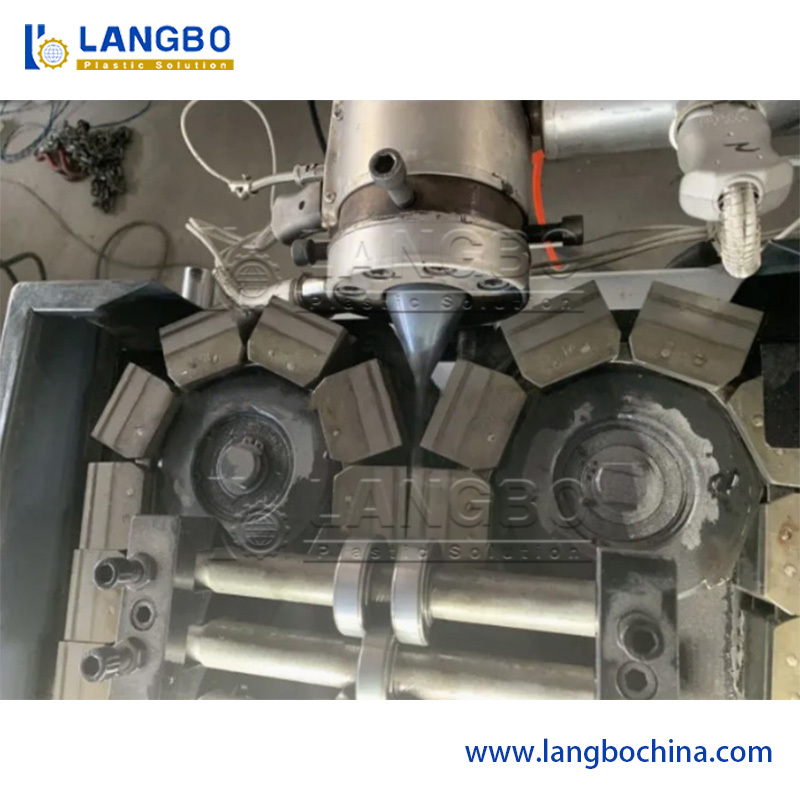 Grânulos de plástico são alimentados no funil e derretidos na extrusora sob temperatura e pressão controladas. O material fundido é então moldado na matriz de corrugação por vácuo ou formação por pressão. Após a moldagem, os tubos corrugados são resfriados com água para estabilizar sua forma. Os tubos resfriados são cortados automaticamente no comprimento desejado e coletados pelo enrolador para inspeção e embalagem.