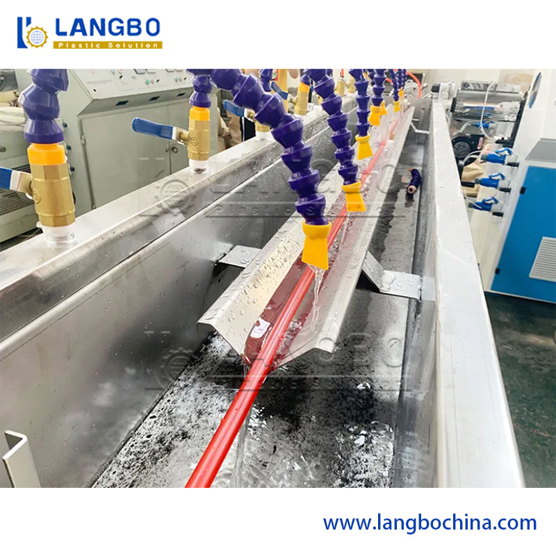 O tanque de água de quatro metros de comprimento garante que o tubo produzido seja resfriado e moldado com pulverização de água fria.