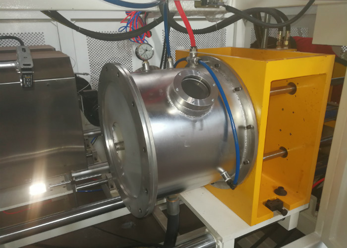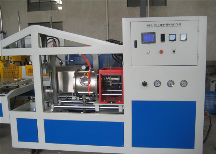 A máquina belling é combinada com a produção da extrusão de tubulações para fabricar a extremidade do soquete das tubulações com tipo de “U”, de “R” e de retangular. O processamento belling deve ser feito dentro da sala belling com o vácuo que dá forma dentro do núcleo de refrigerar belling do molde e de água fora da tubulação a fim obter o soquete preciso.